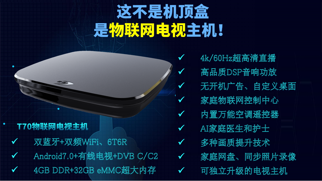 物聯網電視主機,支持4K/60Hz超高清、有線電視、網絡電視、智能家居、健康管理