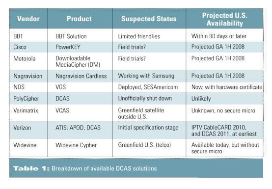 在10年前,每個芯片在生產過程中設置一個唯一的ID號是一個難以做到的事情,而且非常昂貴,機頂盒作為一個軟硬件高度集成的設備不具備DCAS的運行環境。換句話說,DCAS的實現需要一個類似現在智能終端的綜合產業環境,但DCAS生不逢時,這就注定了美國當時DCAS在很大程度上處于探討階段。從Bruce Bahlmann的文章中一個表格可以看出,有眾多聲稱能夠提供DCAS的公司,但基于傳統的軟硬件捆綁的嵌入式系統,實際進展非常緩慢。