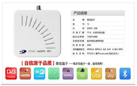 上圖是泰信基于下載CA技術開發的一款智能數字電視機頂盒。該機頂盒具有開放的接口規范,能夠運行基于互聯網的下載CA,并得到了世界技術界的認可。軟件開發者可以從泰信官網上獲取大量詳細的開發資料,機頂盒廠家可以從泰信獲取詳細的可直接生產的軟硬件技術資料。