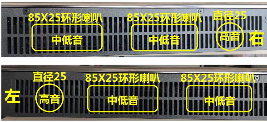 智慧屏的音箱采用了環(huán)形喇叭,紙質(zhì)盆,喇叭邊是橡膠或泡沫的,高音是絲膜的,因為一體化的電視機(jī)拆卸困難,只在外部大體測量,喇叭數(shù)據(jù)見上圖,單位是毫米,音箱腔體容積廠家給的數(shù)據(jù)是1.6L。