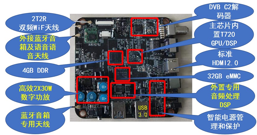 從硬件配置上可以看到T70功能的高度集成,黃色的標(biāo)識都與聲音有關(guān)。可見,與現(xiàn)在的電視和機(jī)頂盒相比,提高的可不止一點點。