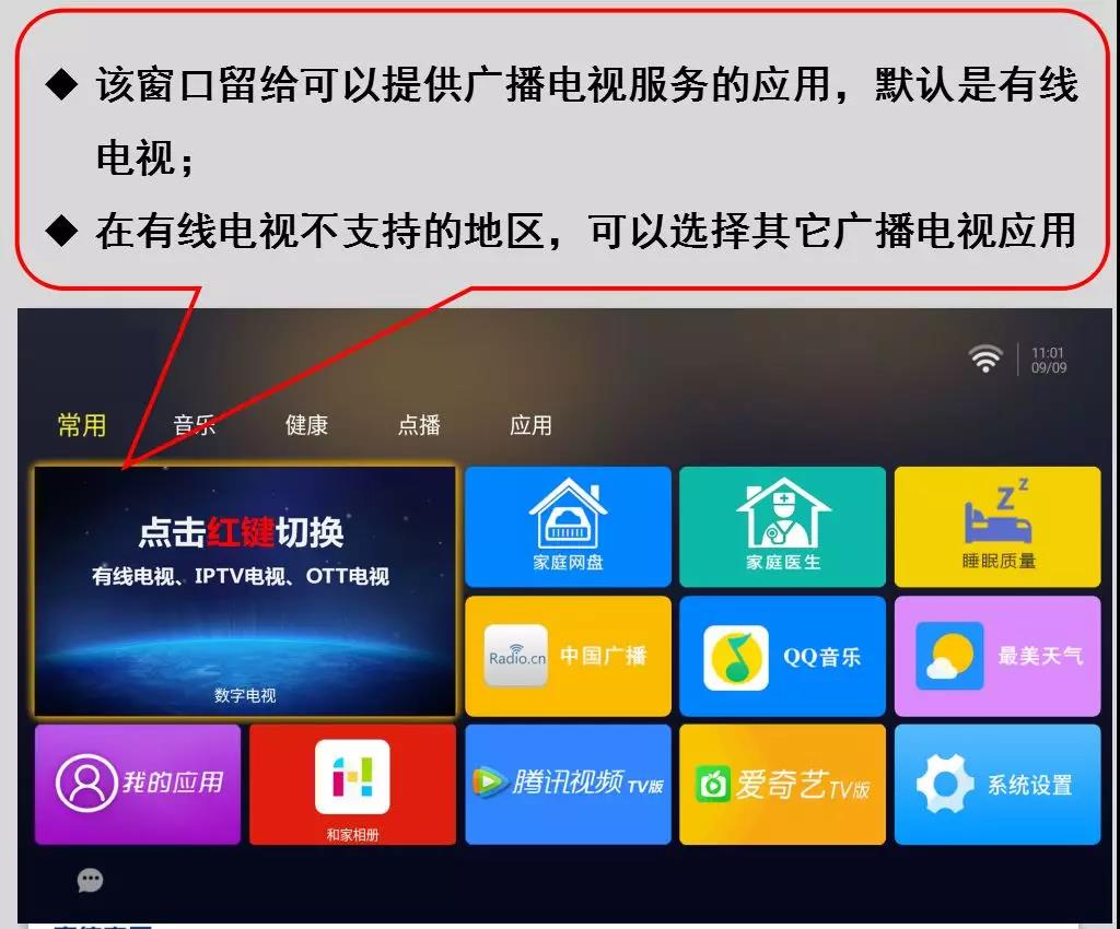 雖然T70在硬件上支持有線電視,也在出廠前作為默認(rèn),但一些地方的有線電視業(yè)務(wù)仍然只捆綁自己的機(jī)頂盒。這時(shí),T70給了用戶更多的選項(xiàng):將焦點(diǎn)移到直播電視窗口,點(diǎn)擊遙控器上的紅色按鍵,切換廣播電視服務(wù)提供商,將選擇權(quán)還給用戶。