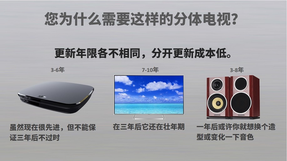 如果從新電視的銷售情況看,一體化電視機是主流。但如果把“機頂盒+電視機”也算作分體電視的話,分體電視是主流,不論新老電視都是顯示器。