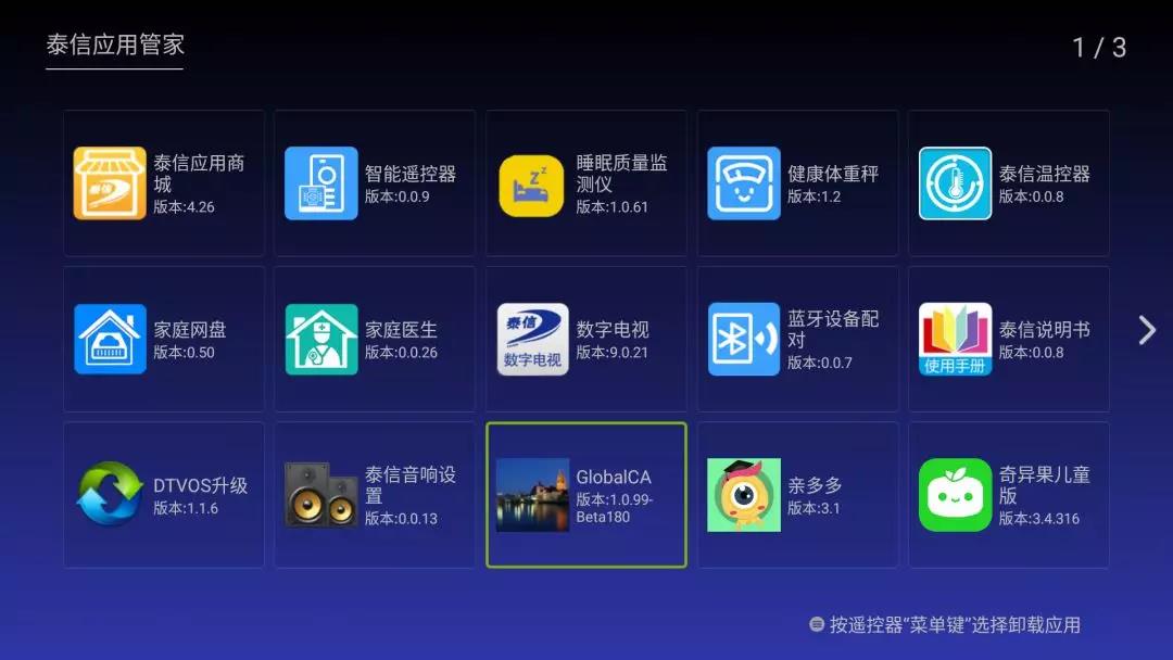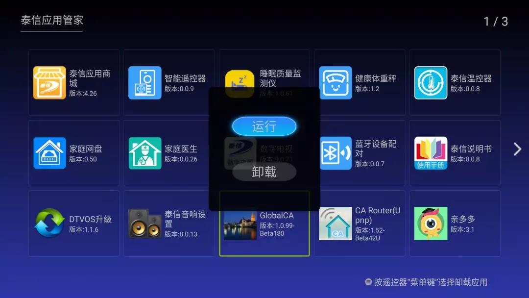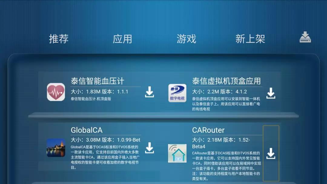 這是泰信機頂盒的底面,有一個智能卡插座,可以把廣電的智能卡插進(jìn)去,但有的加密應(yīng)用需要更換。具體方法是,在泰信應(yīng)用管家中,找到ClobalCA軟件: