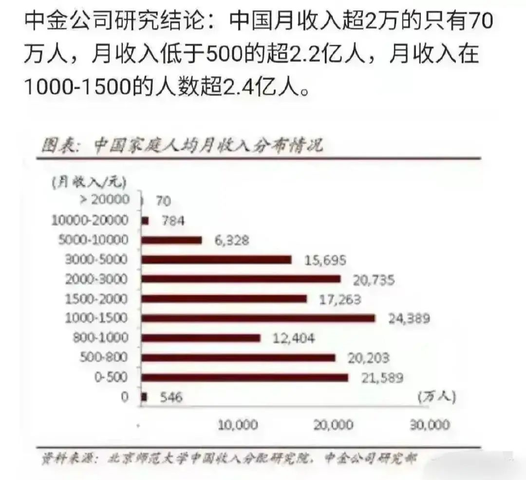 我國家庭人均月收入低于800元的竟然有4.18億,有些讓人詫異。記得有領(lǐng)導(dǎo)說過,我國有6億人月收入低于1000元,看來是準(zhǔn)確的。